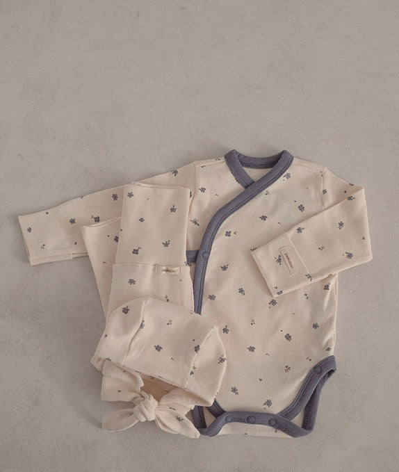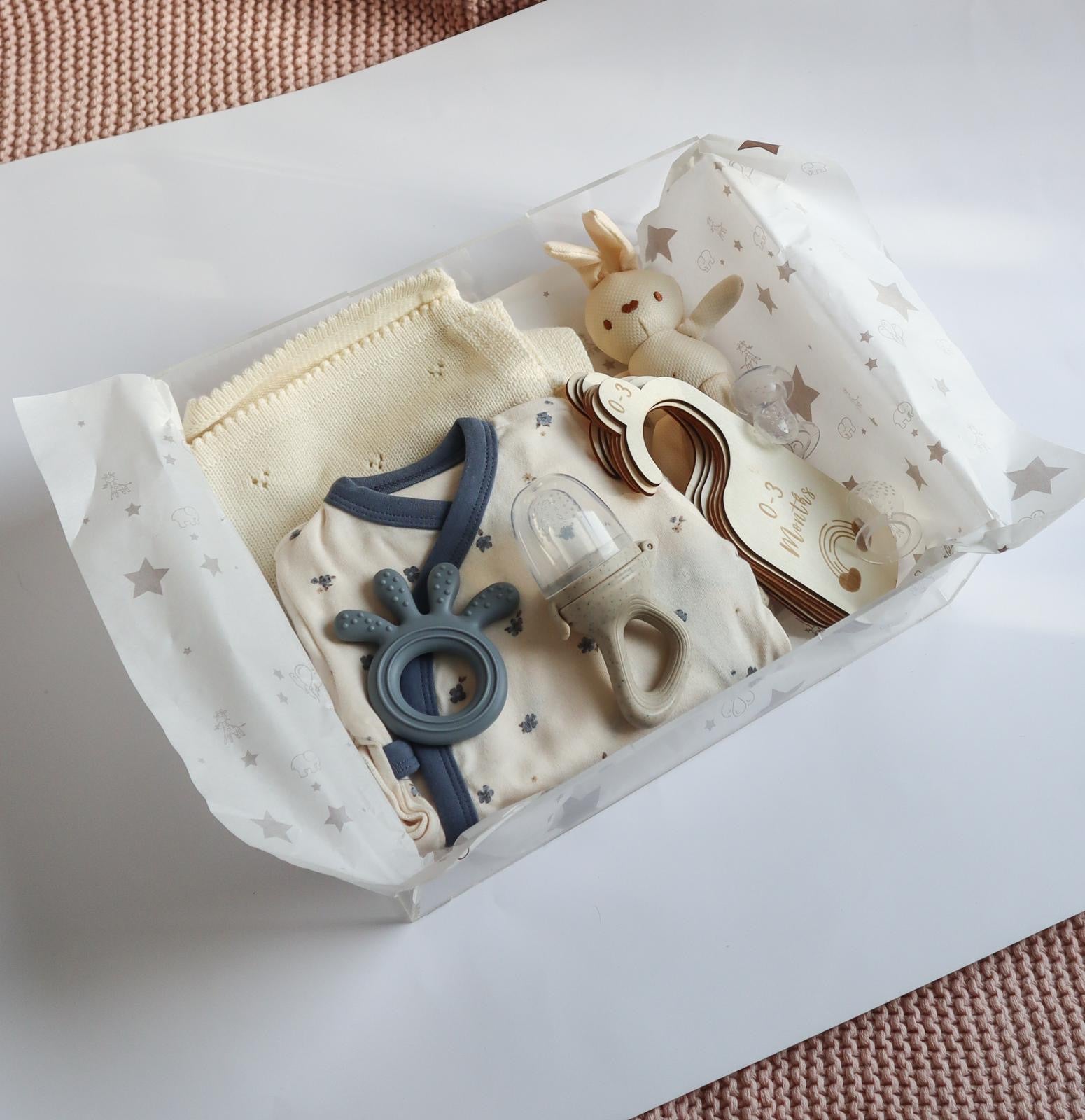 نقدم لكم مجموعة الهدايا المثالية للمولود الجديد🤍 تحتوي على طقم ملابس مريحة، بطانية ناعمة، عضاضه و عبوة اطعام من السيلكون خاليه من BPA/BPS، ودميّة أرنب لطيفة. مثالية لمغامرات صغيرك الأولى